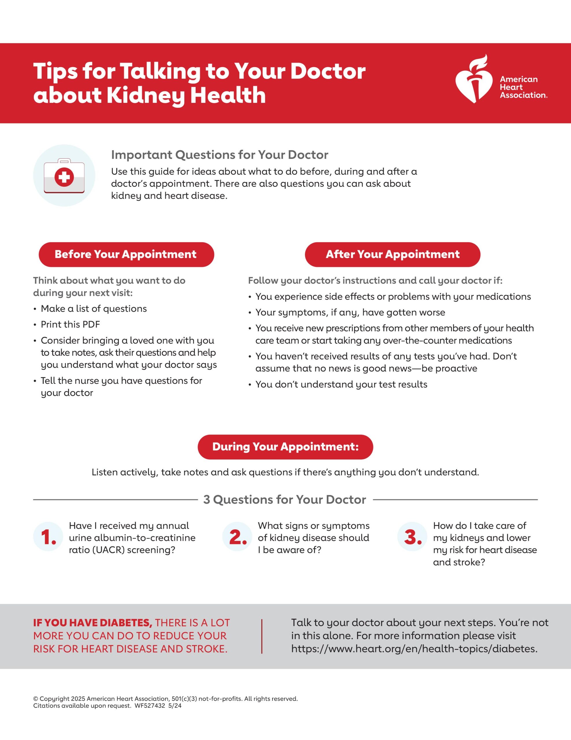 Use this guide for ideas about what to do before, during and after a doctor’s appointment. There are also questions you can ask about kidney and heart disease.